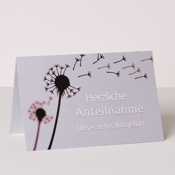 Diese silberne Trauerkarte ist eine wunderbare Möglichkeit, Deine aufrichtige Anteilnahme und Dein tiefes Mitgefühl zum Ausdruck zu bringen. Die Karte ist mit schlichten Pusteblumen versehen, neben denen der Text „Herzliche Anteilnahme. Unser tiefes Mitgefühl“ in einer schlichten, aber eleganten Schriftart präsentiert wird.